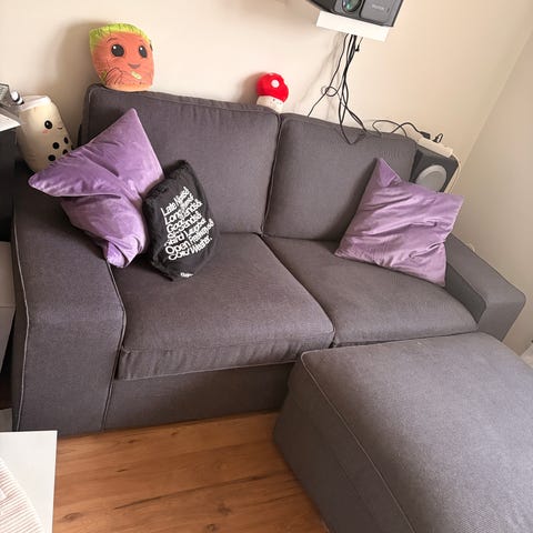 Kivik soffa, 2-sits. Svårt att fånga färgen på bild men se bild 2 för exakt färgton. Soffan har två sittdynor och två ryggdynor samt breda armstöd. Klädseln är i ett textilmaterial med lätt struktur, avtagbart och går att tvätta. Inköpt för cirka ett år sedan. Fint skick. Se mått på bild 3.