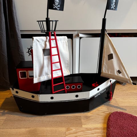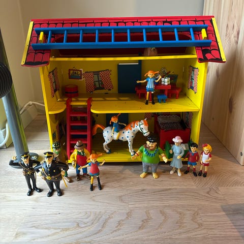 Hoppetossa skepp inklusive Pippi Långstrump figurer (typ alla utom herr Nilsson finns med) Några dubbletter av några karaktärer. Skeppet är trasigt i nån mast och flaggorna på skeppet behöver sig en tvätt. Det går att rulla skeppet (hjul på undersidan)