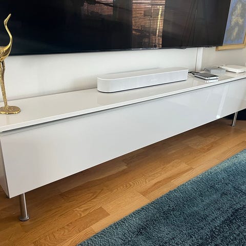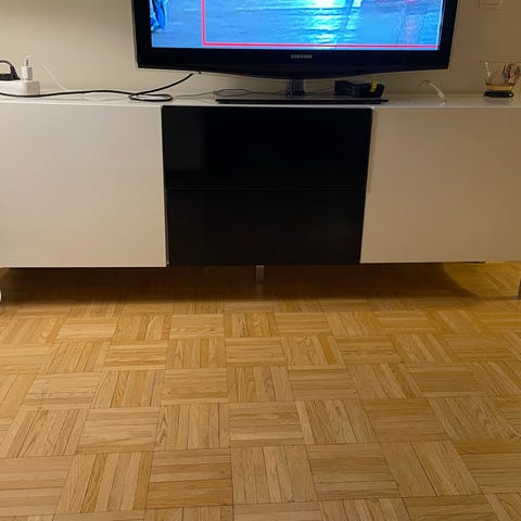Säljer två matchande skänkar från IKEA i vit högglans med skjutdörrar och kromade metallben. Snygga och praktiska som TV-bänk eller sideboard i vardagsrum.