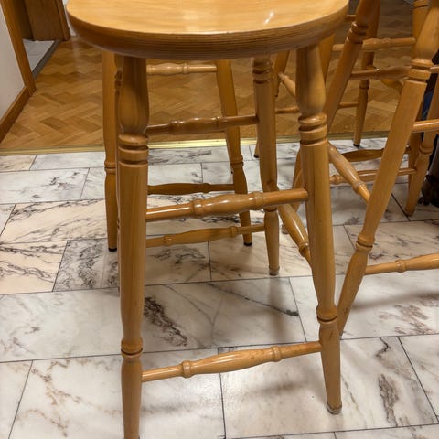 pall i trä med vitlaserad finish. Rund sits med dekorativt, utskuret mönster och fyra ben med tvärslåar för stabilitet. Passar som extra sittplats, sidobord eller avlastningsyta i olika rum i hemmet.från ellos säljes 3 st en av dem har en pinne lossnad men går att limma.