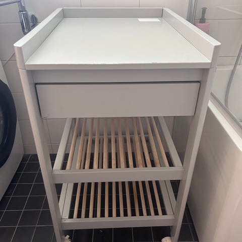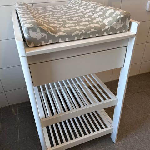 Troll skötbord väggmonterat i vitt utförande. Skötbordet fälls ner från väggen och har en plan skötyta samt hyllplan för förvaring av blöjor och tillbehör. Tillverkat i lackerat trä/material med vit yta. Passar för skötsel av spädbarn och småbarn i hemmet där man vill spara golvyta. Vissa märken och slitage kan förekomma på ytan, se bilder för skick.