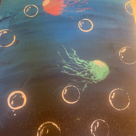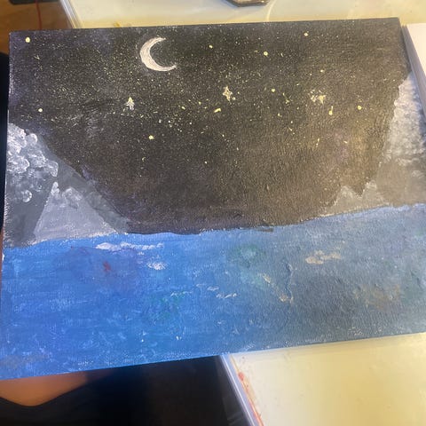 Pris kan diskuteras. Tavla med rymdmotiv i blå toner. Målningen föreställer en natthimmel med stjärnor, måne och små detaljer i kontrasterande färger. Passar som väggdekoration i exempelvis vardagsrum, sovrum eller barnrum. Material och exakta mått är inte angivna.