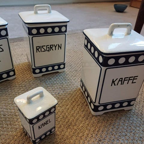 Gamla porslinsburkar / skafferiburkar för Te, kaffe, mjöl och socker.