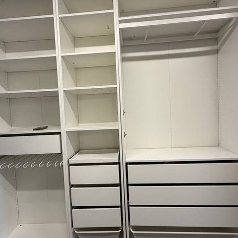 Slim Pax garderober med en spegeldörr och en vitglas dörr även två sektioner i gott skick, ingen skador eller rep och fel. Fullt funkar alla lådorna och skjutdörrar , fräscht. Perfekt för sovrummet eller Hall