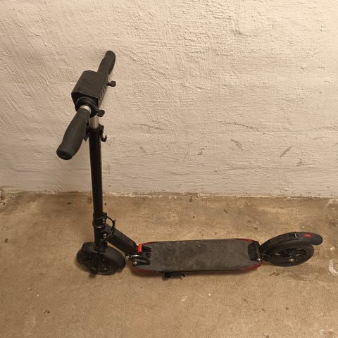 Elsparkcykel i svart färg med gula reflexdetaljer på hjulen. Modellen har två luftfyllda däck, fotplatta med halkskydd och vikbart styre för enklare förvaring. Elkomponenter och kablar syns i chassit, vilket kan tyda på att service eller reparation kan behövas. Passar för kortare transporter och pendling i stadsmiljö när den är i fungerande skick.