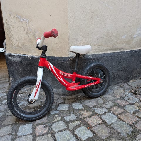 Crescent balanscykel för barn med 12" hjul. Modellen är en springcykel utan pedaler som hjälper barnet att träna balans och koordination inför övergång till vanlig cykel. Cykeln har orange ram, svarta lufthjul, svart sadel och svarta handtag. Passar mindre barn som ska lära sig cykla genom att sparka sig fram med fötterna i marken.