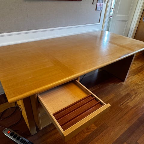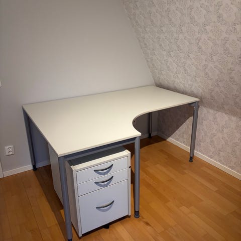 Bordet har några år på nacken. Skicket är överlag gott men har en repa mitt på arbetsytan. Syns dock inte om man har ett skrivbordsunderlägg!