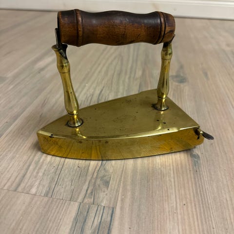 Antikt lodstrykjärn i mässing med handtag i trä, ålder uppskattad till ca år 1900. Strykjärnet har en öppningsbar bakkant för varmt lod, lod finns dock inte. Vill 1160 gram, längd på järnet 13 cm, längd med spännet till öppningen bak 14 cm, som bredast 7,2 cm, med spännet bak 8 cm. Höjd 14 cm. Passar som samlarföremål eller inredningsdetalj. Kan postas.