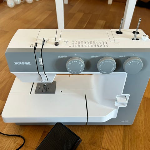 Husqvarna Viking Emerald 116 symaskin i vit färg. Mekanisk symaskin med flera sömmar och inställningar via vred på framsidan. På bilderna syns tillbehör som fotpedal, elsladd, instruktionsbok samt mönster- och sömguider. Maskinen levereras tillsammans med hårt fodral/väska för förvaring och transport. Lämplig för vanligt hushållssömnad som uppläggningar, lagningar och enklare sömnadsprojekt i olika tygkvaliteter.