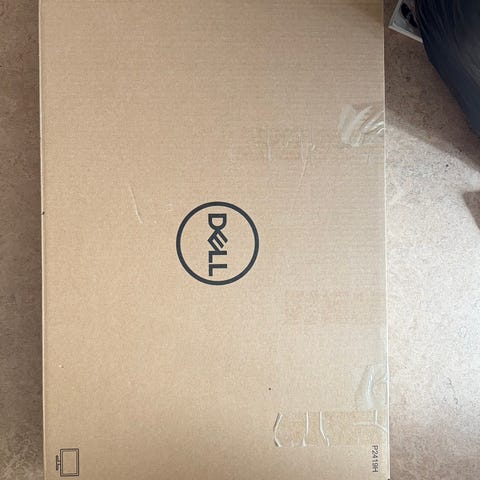 Dell bildskärm med 24 tum skärmstorlek. Levereras med stativ, kablar och dokumentation enligt bilder. Passar för anslutning till stationär dator eller bärbar dator via skärmkablar som följer med, beroende på modell. Färg och exakta anslutningar framgår inte tydligt av underlaget men skärmen är avsedd för vanlig kontors- och hemanvändning.