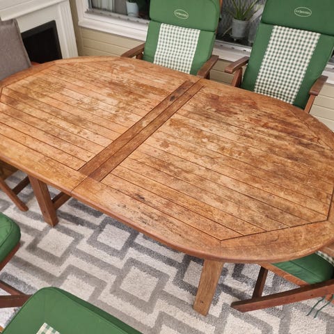 Robust matgrupp för uteplats eller uterum bestående av ett rektangulärt trädgårdsbord och 6 positionsstolar i trä.