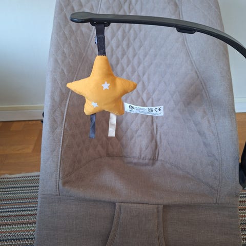 Cam Cam Copenhagen barnstol i form av en hänggunga för barn. Sits och ryggstöd i grön textil med vadderad kudde för ökad sittkomfort. Upphängning med kraftigt rep och trästänger samt dekorativa träkulor och liten träfigur. Passar för inomhusbruk och utomhusbruk där stabil upphängningspunkt finns.