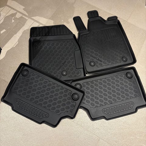 Svarta gummimattor för bil, set om fyra delar för fram- och baksäte. Mattorna är formade med upphöjda kanter och mönstrad yta för att samla upp smuts och väta. Förarsidans matta har extra skydd vid pedalerna. Passar bil med två framsäten och baksäte med två separata mattor. Material i gummi/plastliknande massa som är lätt att torka av eller skölja ren.