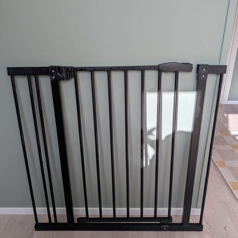 Grindens sektioner kan vinklas för att anpassas runt exempelvis kamin, trappa eller som lekhage. En sektion fungerar som öppningsbar dörr med spärr upptill. Produkten är avsedd för att skapa en avgränsad och säker yta för barn i hemmet och kan monteras mot vägg med medföljande fästen enligt bruksanvisning.