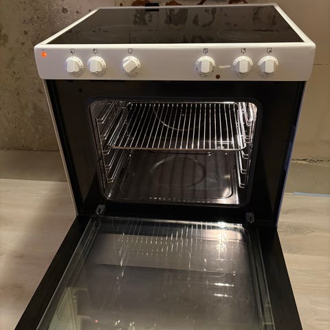 Ugnen är vit med glaslucka och metallhandtag. Den har vred för inställning av temperatur och ugnsfunktioner samt en digital display i mitten. Invändigt finns flera ugnsnivåer med galler och plåtar. Ugnen är avsedd för inbyggnad i köksskåp och passar för vanlig matlagning och bakning med varmluft.
