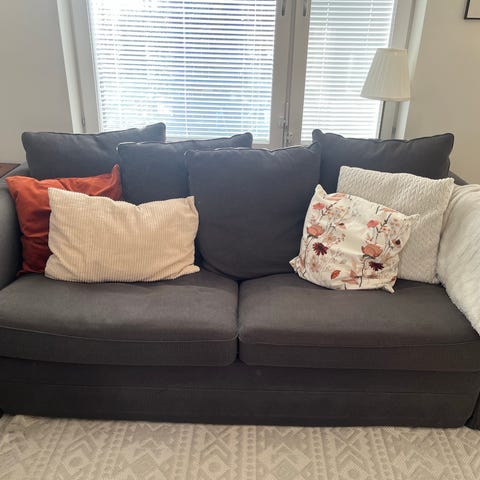 Sittdynorna är slitna och behöver antingen lagas eller kläs om, i övrig är det en jätte fin soffa!