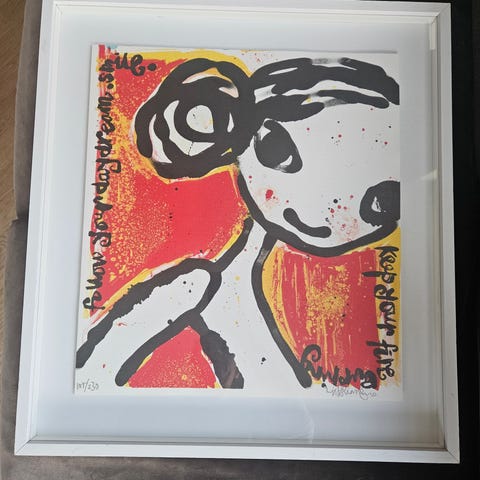 Signerad och numrerad original litografi av Peter Johansson med det ikoniska dalahästmotivet med måltavla. Ramad bakom glas.
