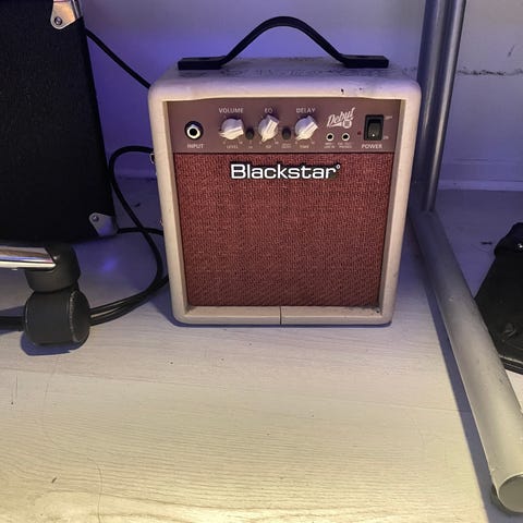 Laney LA10 Acoustic förstärkare. Denna kompakta förstärkare är designad för akustiska instrument och erbjuder en balanserad ljudåtergivning. Den har kontroller för volym, bas och diskant, samt en aux-ingång för att ansluta externa ljudkällor. Förstärkaren är utrustad med en strömbrytare och en strömkabel.