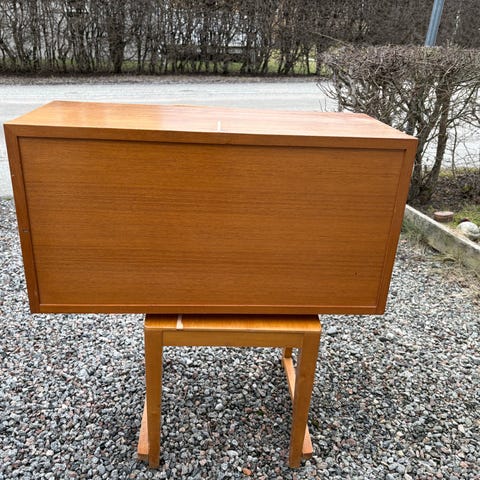 String förvaringsskåp formgivet av Nils Strinning. Skåpet är tillverkat i träfaner med varm träton och står på benstativ i samma material. Framsidan har en nedfällbar lucka som bildar en plan yta när den är öppen. Invändigt finns flera fack och hyllplan för organiserad förvaring av till exempel böcker, papper eller mindre föremål. Passar som fristående förvaringsmöbel i vardagsrum, hall eller arbetsrum.