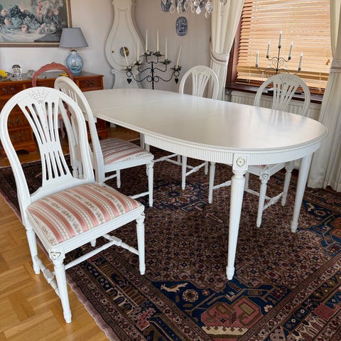 Säljer en mycket fin och stilren matgrupp med 6 stolar (varav två är karmstolar), ovalt matbord med två iläggsskivor samt matchande. Perfekt för dig som vill ha en ljus och elegant matplats. Möbeln har fina detaljer och ger ett exklusivt intryck i hemmet.