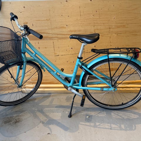 Vacker gammelgrön ram, brun lädersadel, matchande sydda handtag och klassisk design. Stilig som få med stålram, aluminiumskärmar och stora lättrullade 28″ hjul. Handbroms och fotbroms bak, precis som det ska vara.
