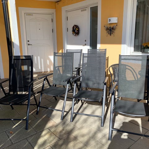 Stolarna är svarta med flätad rygg och sits i regntåligt material. De är hopfällbara och lätta att hantera. Säljs i par.