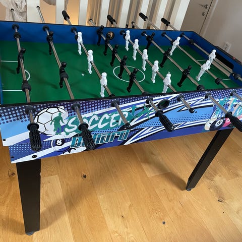 Bordfotboll spelbord i standardstorlek med grön spelplan och svart stomme. Spelbordet har flera spelstänger med handtag och figurer monterade i två lag. Passar för inomhusbruk i exempelvis spelrum, vardagsrum eller källare. Bordet står på fyra ben och är avsett för flera spelare samtidigt.