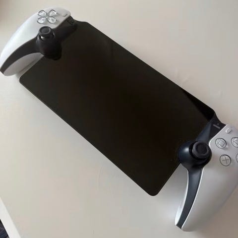 Sony Playstation 5 Portal handhållen spelkonsol i vit färg. Enheten är utformad för att användas tillsammans med Playstation 5 och har inbyggd skärm samt integrerade handkontroller på sidorna. Konsolen har styrspakar, knappar och triggrar liknande en vanlig PS5-handkontroll. Anslutningar och reglage finns längs ovankant på enheten. Lämplig för spelstreaming från en Playstation 5-konsol i hemmet.