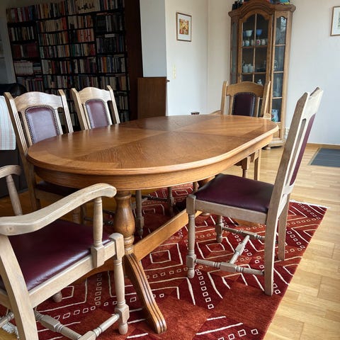 Ett fint ekbord som jag har i källaren därav inget foto. För 10 personer om man räknar två på nocken ,med iläggs skiva , slumpas bort pg.av flytt.