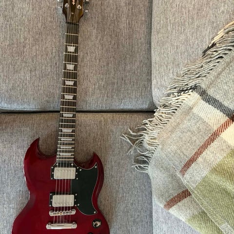 Gibson SG special 2021 i vintage cherry som väger 2.9 kg så åt de lättare hållet bra gitarr men jag är lite mer av en humbucker snubbe så den får gå till nån annan.