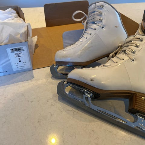 Risport konståkningsskridskor för barn i storlek 32. Klassisk vit modell med högt skaft och snörning för stabil passform runt fot och ankel. Blad i metall med tåtagg framtill, lämpliga för konståkning och övrig skridskoåkning på is. Överdel i slätt material med förstärkt hälparti i kontrastfärg. Passar barn som behöver skridskor för träning eller fritidsåkning på is.