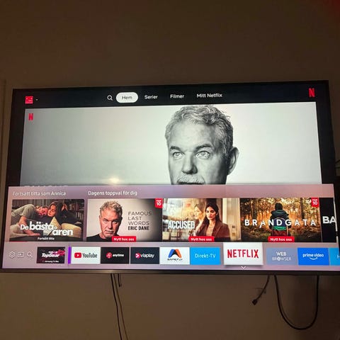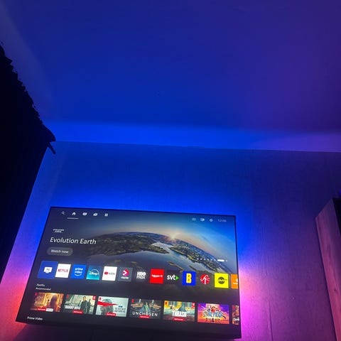 Philips tv med ambilight. Platt tv med bakgrundsbelysning mot väggen. Visar smart-tv‑gränssnitt med olika appar och tjänster. Tillhörande stativfot i metall ingår enligt bild samt väggfäste