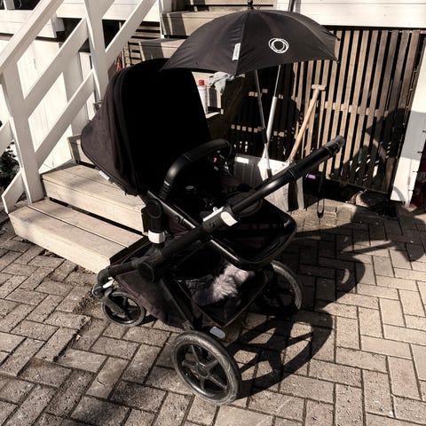 Tillbehören regnskydd (köpt nytt av oss, det som ingick gick sönder) myggnät, mugghållare, sommarsufflett samt däckskydd ingår.