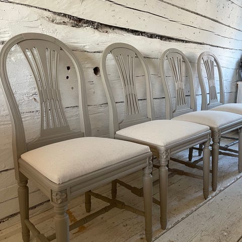 4 köksstolar i gustaviansk "Axet"-stil. Stolarna har dekorativ rygg med utskurna detaljer och svarvade ben. Målade i vit/beige med stoppad sits i grönt tyg.