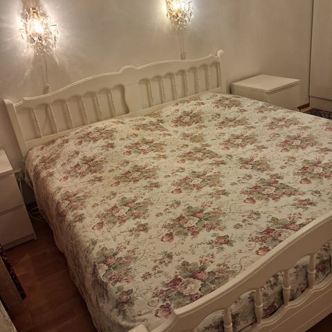 Dubbelsäng, mått sängram: 210x194x89cm i gott skick säljes pga. att rummet måste omdisponeras. Sängram i vitt trä med huvud- och fotgavel (höjd 89cm resp. 66cm). Sängen har en ljus träbas med en mörkare överliggare i trä upptill på gavlarna.