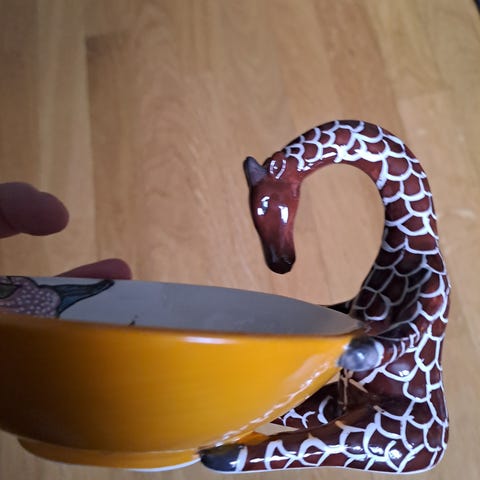 Charmig giraff i trä, cirka 84 cm. Sannolikt Östafrika. Notera bild 3 där färg flagna, kräver en ditt av rött nagellack. Mkt enkel inristning under foten, N M, som, enligt AI, tyder på genuint hantverk. "Professionella träsnidare i regioner som Akamba (Kenya) använder sina arbetsknivar för att snabbt markera sitt verk. Det är en personlig signatur som görs "i stunden" innan figuren skickas vidare till försäljning eller export." Trist med lite högre frakt pga höjd, kan avhämtas lr transporteras efter överenskommelse.