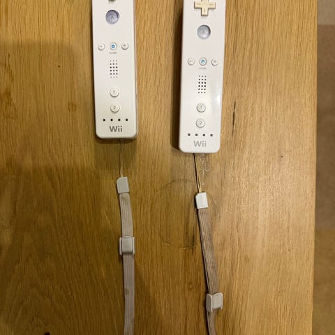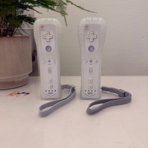 Nintendo Wii handkontroller med tillhörande nunchuk. Två vita Wii-fjärrkontroller med handledsremmar och två vita nunchuk-enheter med kabel. Passar till Nintendo Wii-konsol för spelstyrning med rörelsekontroll och analog styrspak.