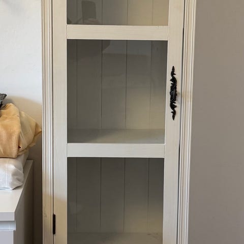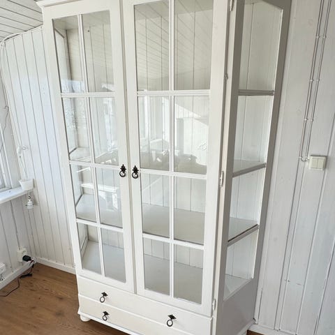 Vitrinskåp med vit stomme och glasdörr med krysspröjs. Skåpet har flera hyllplan i glas som ger god överblick över innehållet. Samt två lådor nederst.