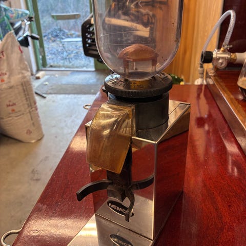 Den har stått oanvänd länge eftersom vi har en annan kvarn, men jag har nyligen gått igenom den och rengjort den grundligt. Förra ägaren hade nyligen bytt malskivor, så de är ganska fräscha. Jag har monterat en ny bottenplatta och bytt utkastpipen.