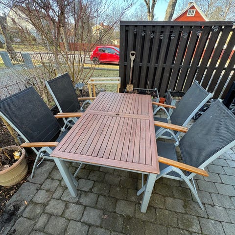 Trädgårdsgrupp med matbord och stolar i trä i brun nyans. Omslipat 2025 och oljat.