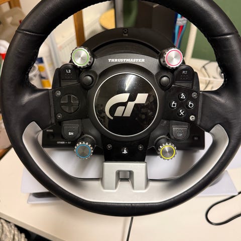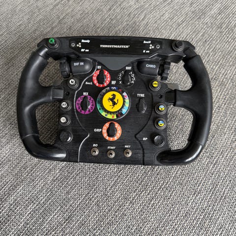 Thrustmasters Ferrari 599xx Evo-ratt med Alcantramaterial. Har en uppdaterad quick release, så den funkar med de nyare direktdrivna hjulbasarna så som T598.
