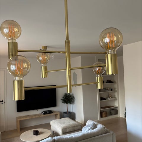Fin taklampa med flera glödlampor och metallfäste i mässingsfärg. Lampan ger ett fint och varmt ljus och passar perfekt över matbord eller i vardagsrum.