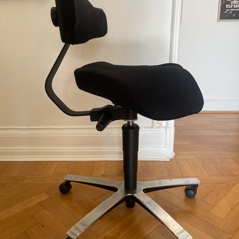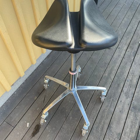 Begagnad Salli sadelstol i använt skick. Den är använd i vårt hemmakontor ca 8 år (inköpt ny).