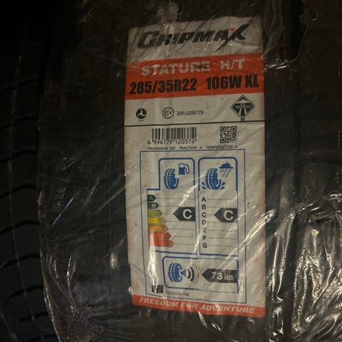 Jämnslitna och är i gott skick. Ett däck lagat på pyspunka men håller tätt utan några bekymmer som helst.