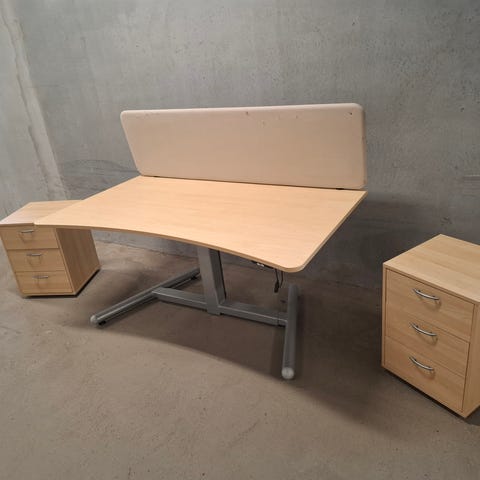 Eftersöker bänkar eller skrivbord som är 120-135cm x 50 cm och stolar som gärna har tyg, Svarta, gråa, blåa och orange'a färger gäller primärt !