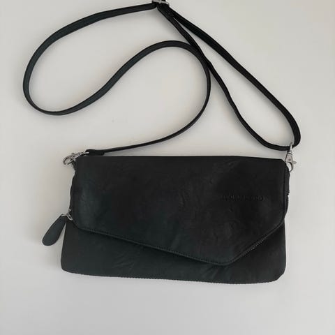 Mörkgrönt axelremsväska i mocka. Väskan har en lång axelrem för bärning över axeln eller tvärs över kroppen. Framsidan har ett lock som stängs med guldfärgad metallring och kedjedetalj. Passar för vardagsbruk med plats för mindre personliga tillhörigheter som plånbok, telefon och nycklar.