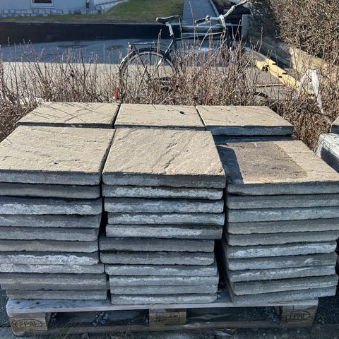 Betongplattor för markläggning i grå nyans. Plattorna lämpar sig för gångar, uteplats eller andra ytor utomhus. Blandade storlekar och tjocklekar kan förekomma enligt bilderna. Passar för den som vill anlägga eller komplettera en yta med marksten i betong.