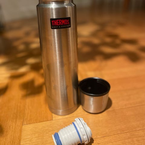 Termosflaskan har dubbla väggar och håller värmen länge.
