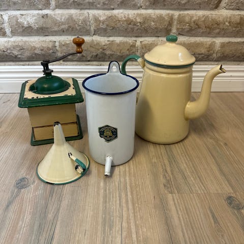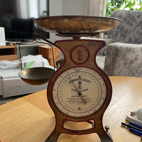 Vintage hushållsvåg i emaljerad metall. Mekanisk köksvåg med analog skala upp till 10 kg. Skalan är graderad i kilo och gram för vägning av exempelvis matvaror eller andra mindre föremål i hemmet eller köket.