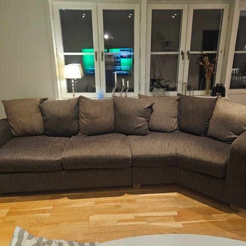 Mio soffa i brunmelerat tyg. Rak modell med två sittkuddar och två ryggkuddar. Soffan har armstöd i samma höjd som ryggstödet och står på en synlig bas i trä. Passar som sittmöbel i vardagsrum eller liknande utrymme.